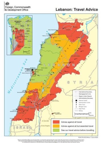 أصدرت الخارجيّة البريطانيّة تحذيرًا من السّفر بشكل تام إلى المناطق الواقعة جنوب نهر اللّيطاني وكذلك إلى قرى الحدود الشّرقيّة والشّرقيّة الشّماليّة في البقاع إضافةً إلى محافظ عكّار.